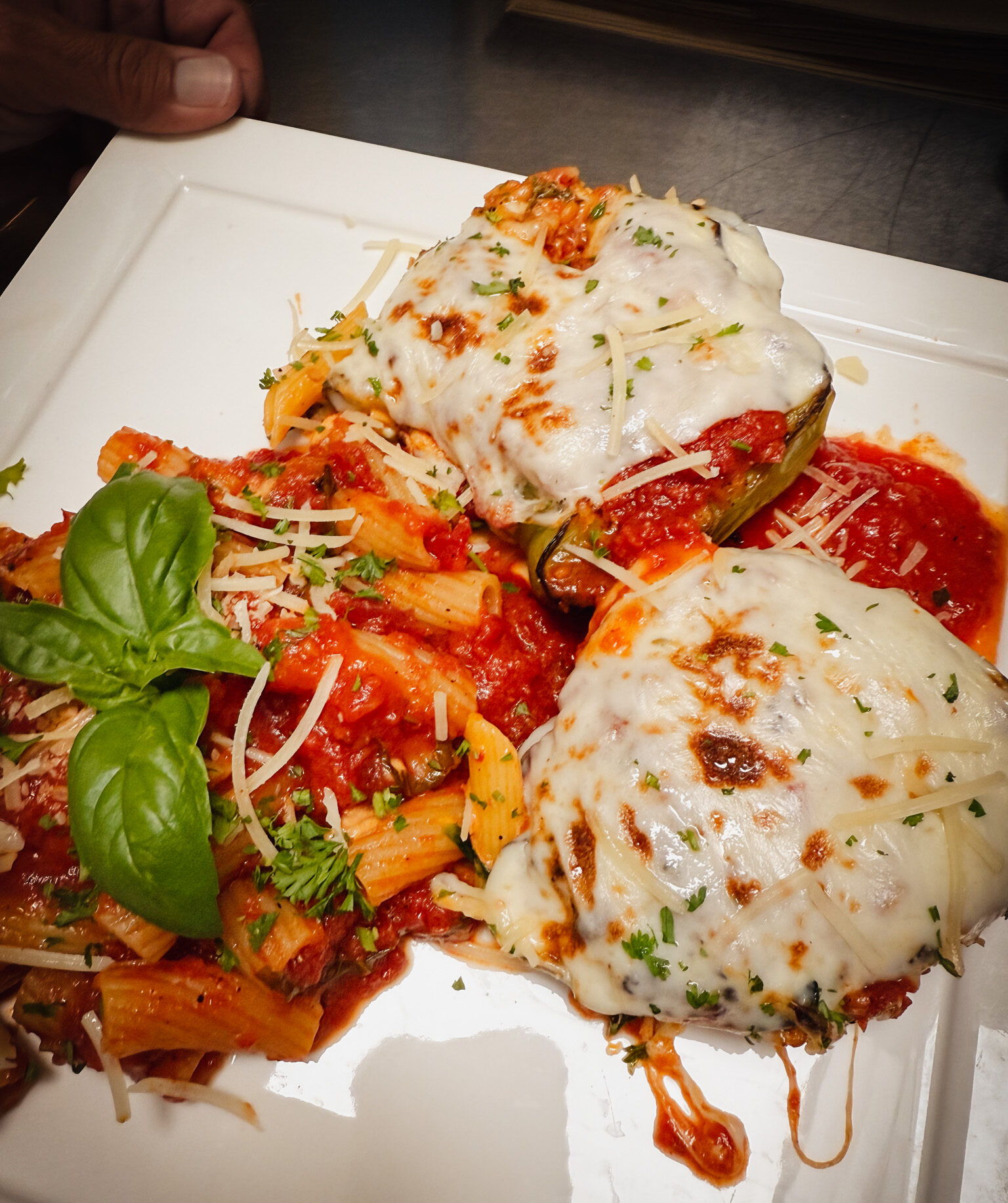 with HOT Italian sausage, meat sauce, mozzarella & green peas. Served with rigatoni in marinara sauce.